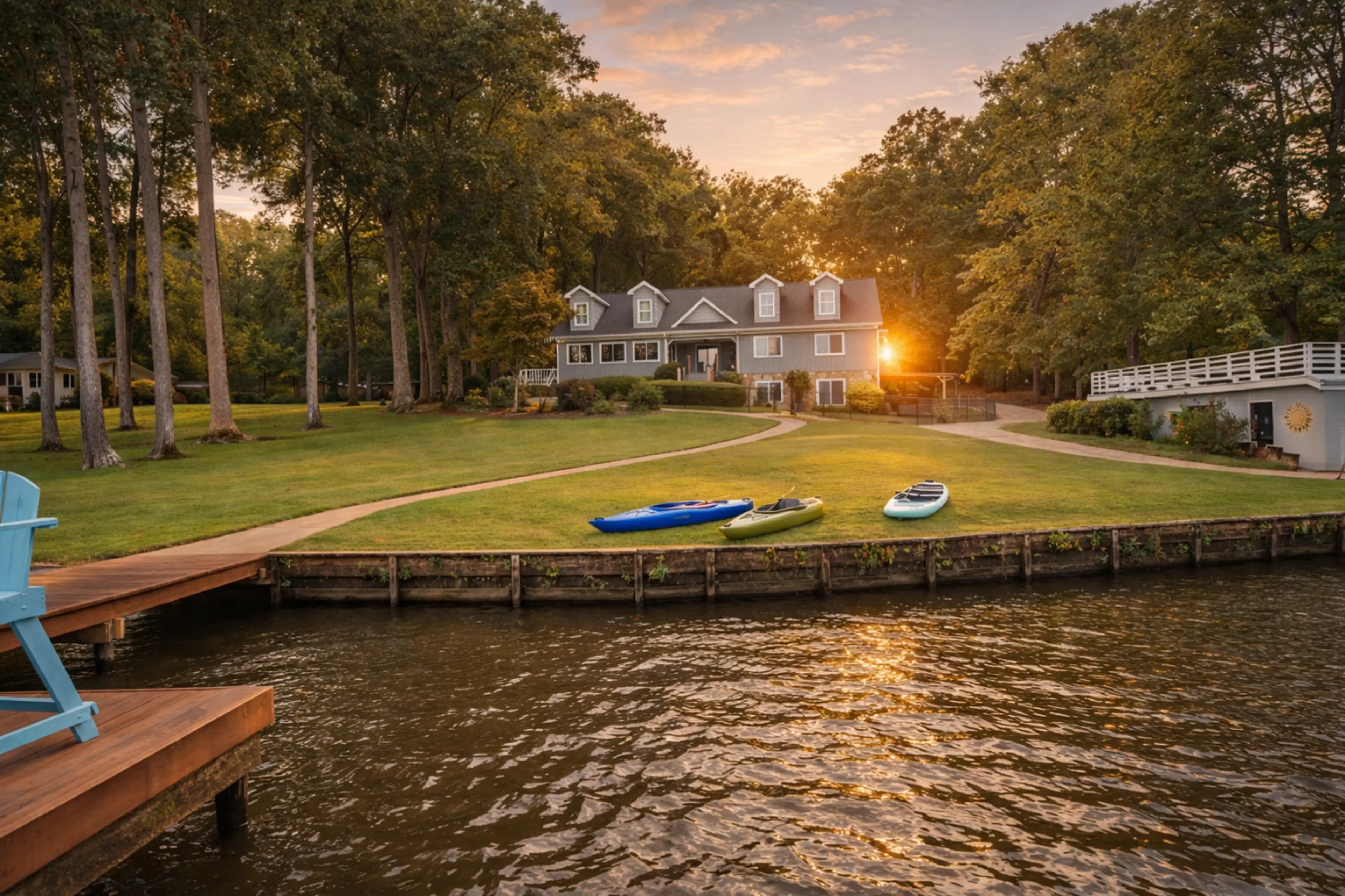 Five bedroom Lake Sinclair waterfront home with private deep-water dock, four king bedrooms, and a bunk room for additional sleeping. Kayaks provided for lake use. Outdoor living includes a fire pit and large deck with pellet and propane grills. Interior features open gathering spaces and a dedicate...